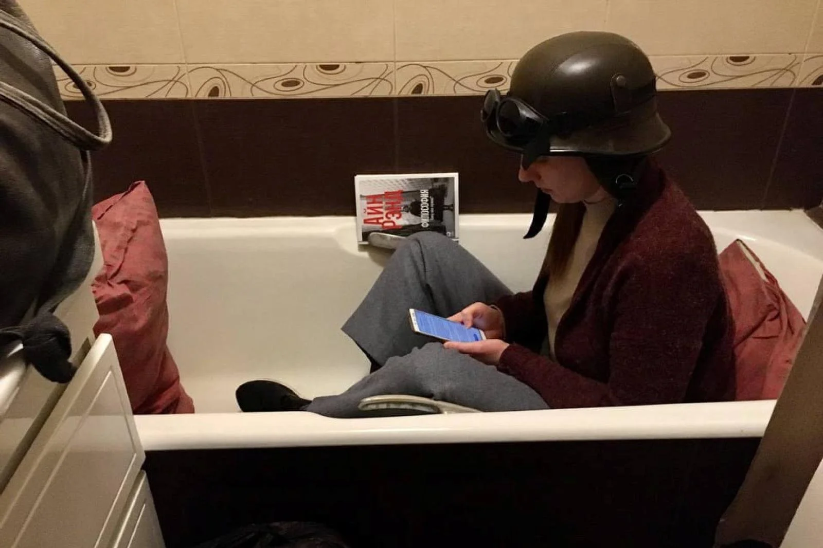 Julia hat mir heute ein Foto geschickt. Sie sitzt in der Badewanne. Nein, es ist nicht das, woran ihr denkt. Sie nimmt kein Bad. Voll bekleidet, auf dem Kopf ein Safarihelm, oben drauf eine Schutzbrille. War halt ein Set. Um sie herum ein paar Kissen, das Smartphone hält sie in der Hand. In der Ablage, wo normalerweise Badeutensilien liegen, ein Buch von Ayn Rand: „Philosophie: wer braucht das schon?“ Im normalen Leben war sie Kulturmanagerin.