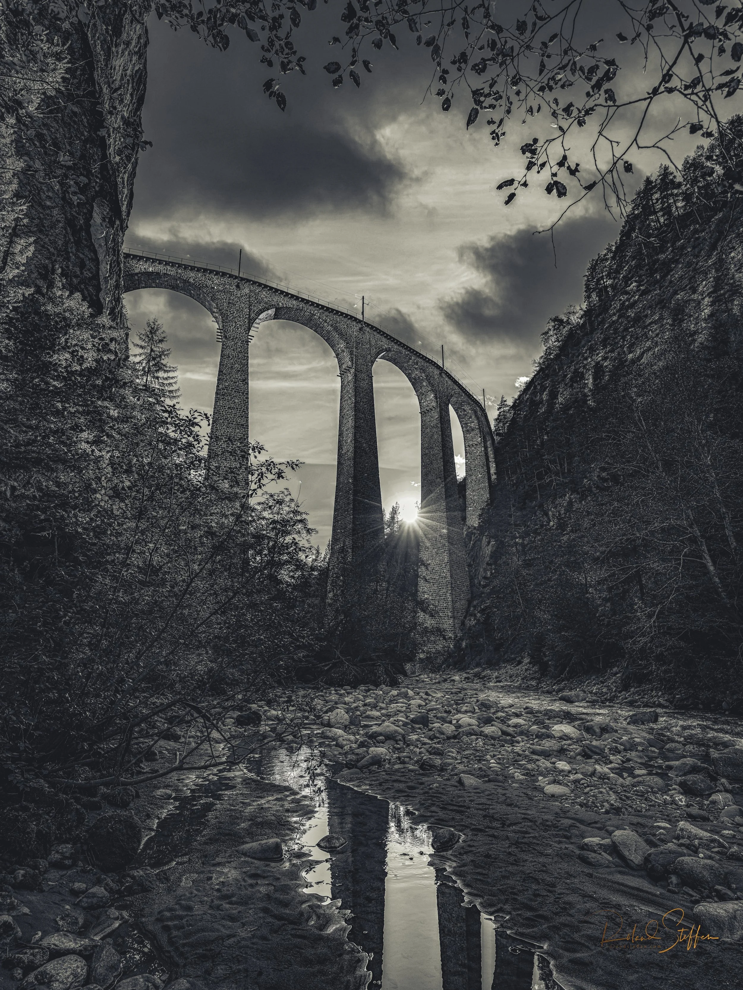 A must for all railway enthusiasts - beauty and boldness combined. With its 65m high piers tapering upwards, the viaduct is one of the most elegant bridge constructions in Graubünden and the most photographed work of art of the Rhaetian Railway in Switzerland. Construction began in 1901, at a time when only black-and-white photography was available. Therefore, the following black and white pictures are also a homage to this time.