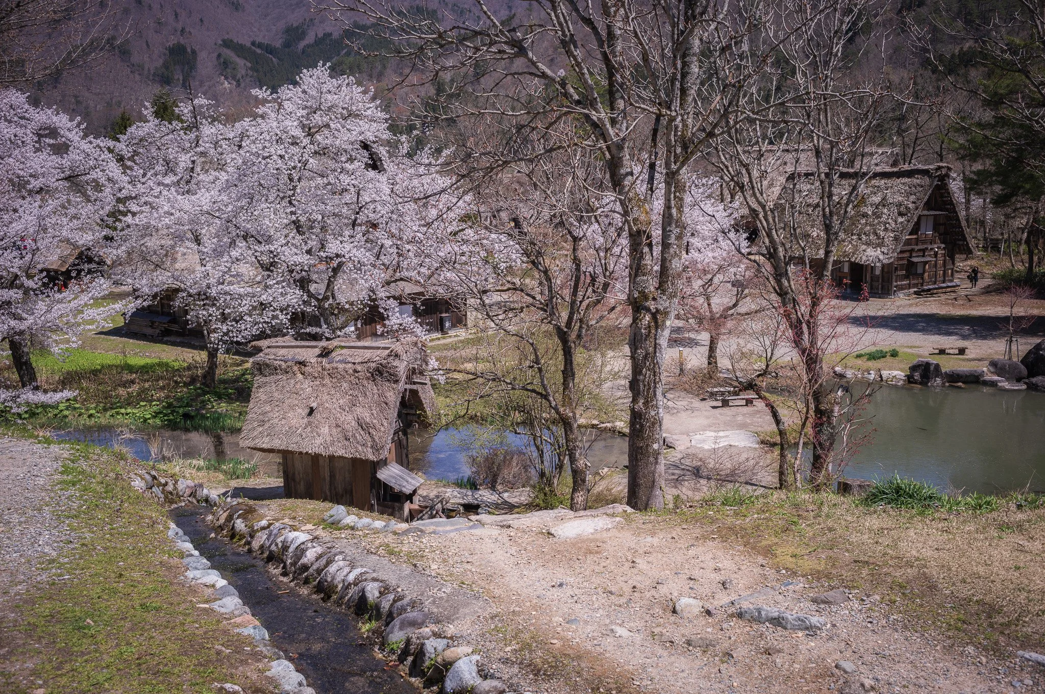 Shirakawa-gō mit blühenden Kirschbäumen.