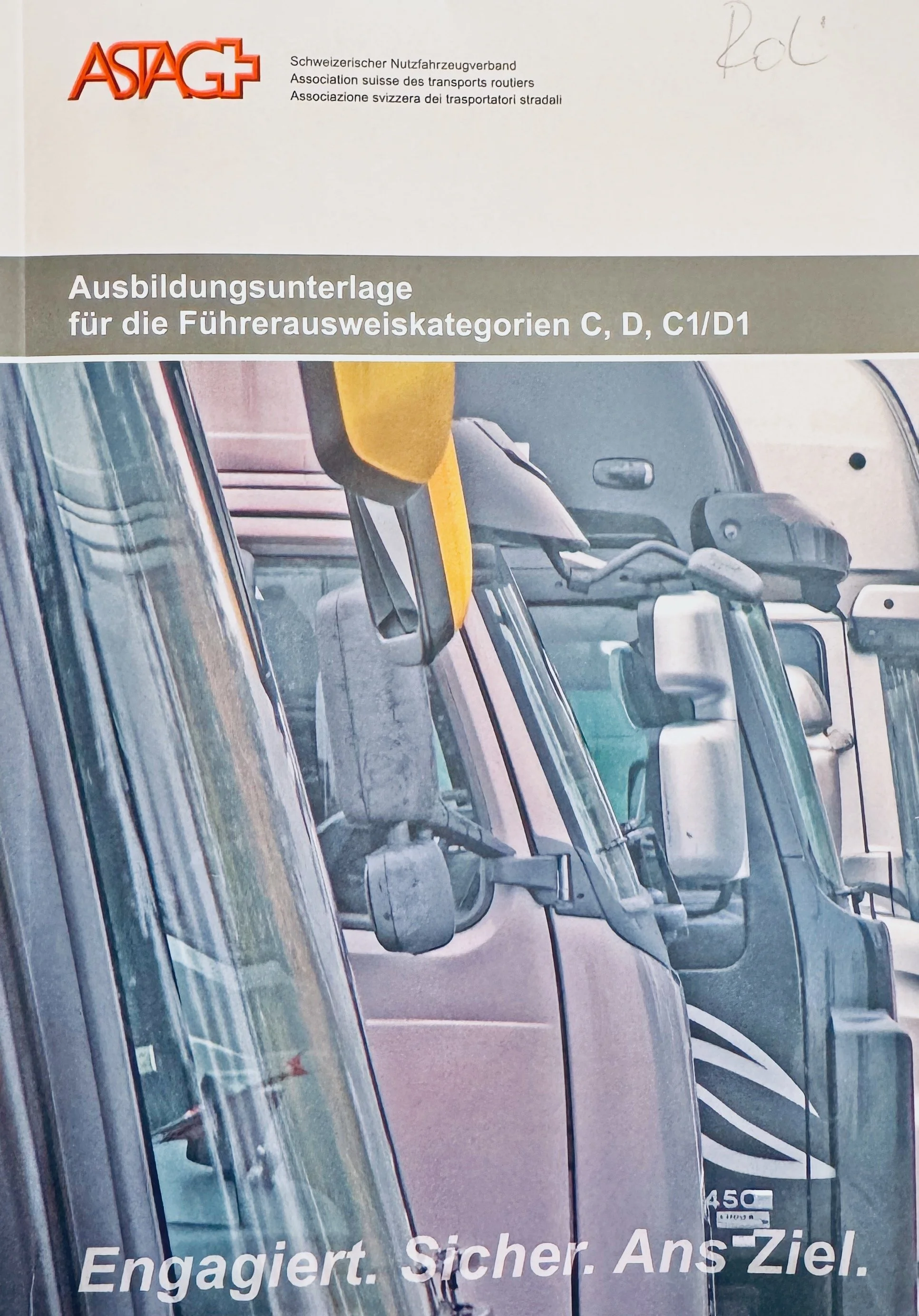 Bei der Theorieprüfung in der Schweiz muss man mindestens 27 von 30 Fragen richtig beantworten - und die sind nicht immer ganz einfach. Der C1-Stoff für die Prüfung behandelt nämlich diverse Themen wie Fahrzeuge und Ausweise, Signale und Markierungen, Regeln und Vorschriften, ARV (Arbeits-, Lenk- und Ruhezeit), Masse und Gewichte, Gütertransport, Personentransport, Fahrzeugtechnik und Unterhalt sowie Anhängerbetrieb. Der Stoff im Lehrbuch von ASTAG umfasst ingesamt hundert Seiten und vieles ist schon ziemlich LKW-lastig, was für unser neues Fahrzeug (4.1 Tonnen) eigentlich gar nicht relevant ist.